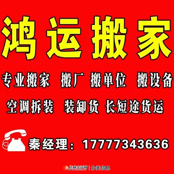 桂林鸿运搬家。专业搬家,搬钢琴,搬厂,搬单位,搬设备,搬红木,空调拆装,办公家具拆装,启重吊装,会展人力,市区货运,卸货,垃圾清运等各项生活服务