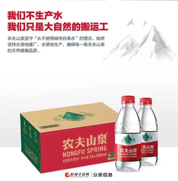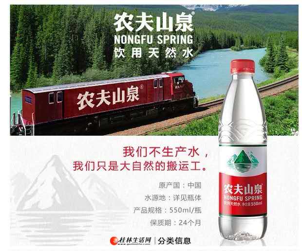 我们是桂林首家饮用水订购的线上服务平台。“专业、诚信、品质、方便”是我们对广大客户的承诺。经过长时间的资源整合,桂林送水郎团队已与农夫山泉,娃哈哈,怡宝,百岁山,景田,千家洞,甲天下,众多品牌瓶装水生产商、经销渠道商建立了广泛的信任合作伙伴关系,优化整合了各方资源,大大提升了饮用水的配送速度和服务范围。让每一个用户满意是我们的目标,多种订购方式,多样的品牌选择,让足不出户的您轻松的便能享受到我们优质贴心的服务!工商注册,能开具正规普票,专票!电话:13558031195(可加微信)