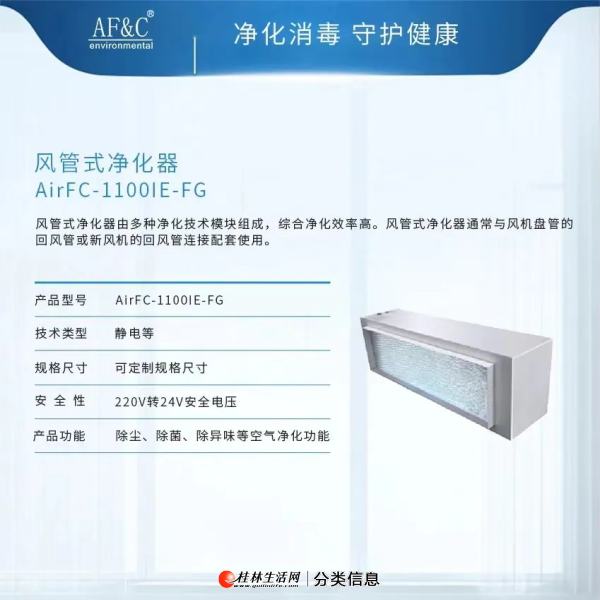 在空调机组回风口处安装AirFC-1100IE-FG风管式高压静电空气净化装置,该产品采用高压静电净化技术,高压电离+高压吸尘杀菌+电子增强介质高效极化吸附,无辐射,无臭氧,不产生火花,无二次污染,可高效捕获小至 0.01μm 的颗粒物,有效去除空气中的PM2.5、烟尘、毛屑、异味等各类污染物;净化模块薄至52mm,风管净化空段整体安装,节省空间,维护简便,适用性兼容性强,保持管道洁净,减少维护次数及成本;与空调机组启停同步、连锁运行。