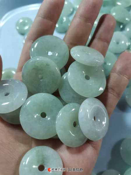 糯化种,豆绿色(少许货飘蓝花),尺寸硬币大小,厚度普遍卡6毫米,