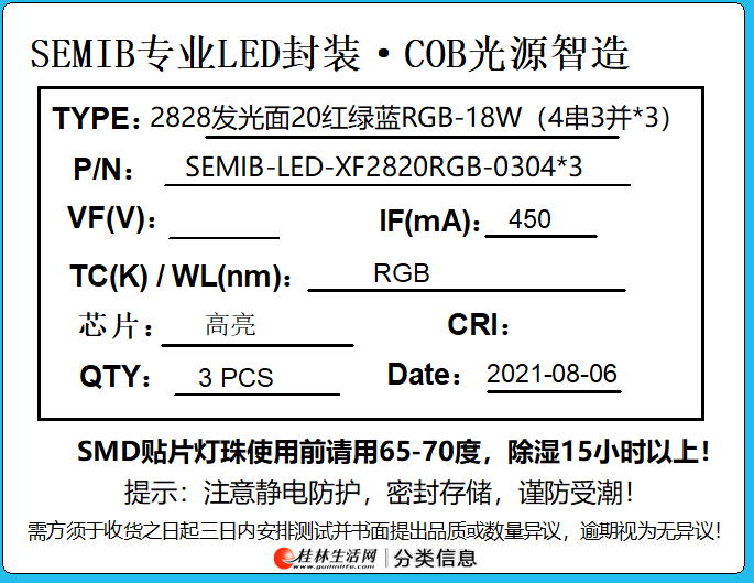 2产品名称:2828发光面20红绿蓝RGB-18W(4串3并*3)