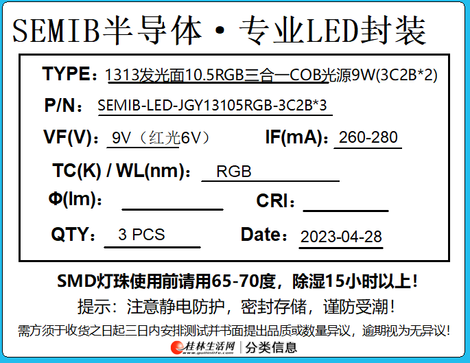 2产品名称:1313发光面10.5RGB三合一COB光源9W(3C2B*2)