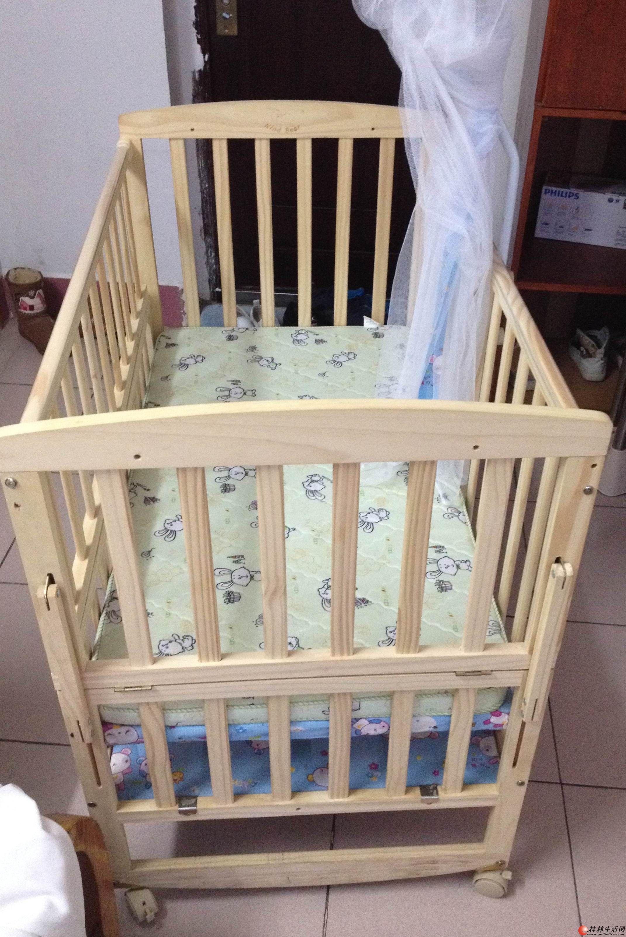 给宝宝买的婴儿车他自己不习惯睡,婴儿床 蚊帐 椰棕床垫一起价值400多现在便宜处理了,位置在象山区西城步行街忽近,婴儿床是全实木的没有刷漆,安全环保非常新哦,可随时来看