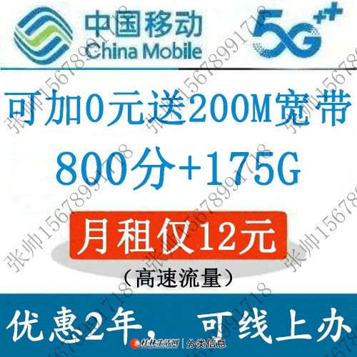广西移动12元送800分+175g+200m宽带,可提速至500m或1000m 加入收藏我要举报