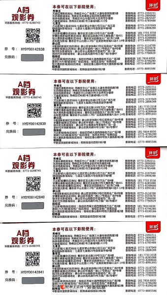 桂林电影兑换券4张,电影院购票半价转让。适合请女友看电影等 加入收藏我要举报